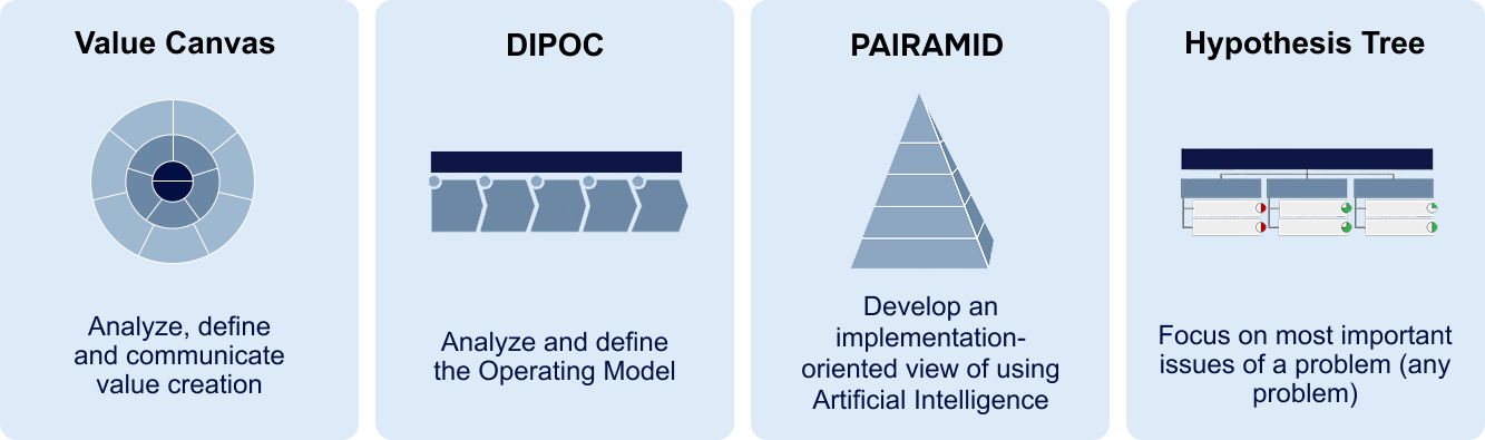 Structuring the situation and problem our client is facing is already an important part of value creation. Most issues today are not being solved because their structure and underlying logic is not clear, not understood, not stable or simply not accepted and followed by relevant stakeholders