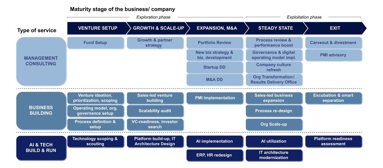 Our team has built over 15 ventures, including own greenfield startups across industries such as Software, Food, Real Estate, and Consulting/ Staffing. This also includes corporate startups for, and jointly with, our large-scale clients, e.g. in the Manufacturing and Energy industries